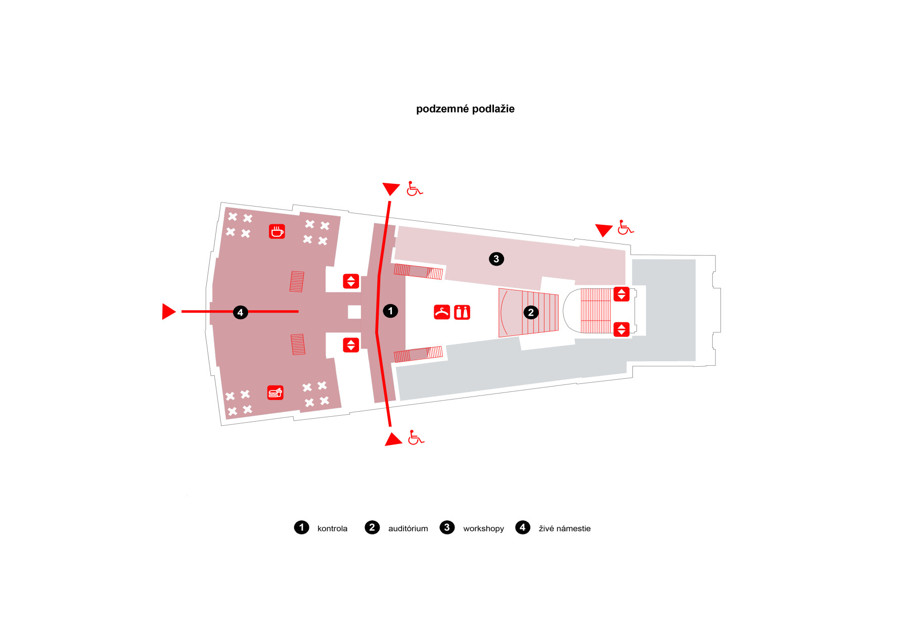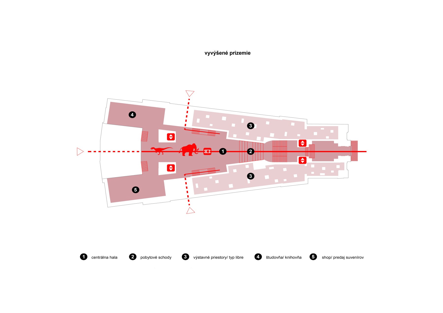 zostáva zachované ako architektonický prvok pre pešiu cirkuláciu.