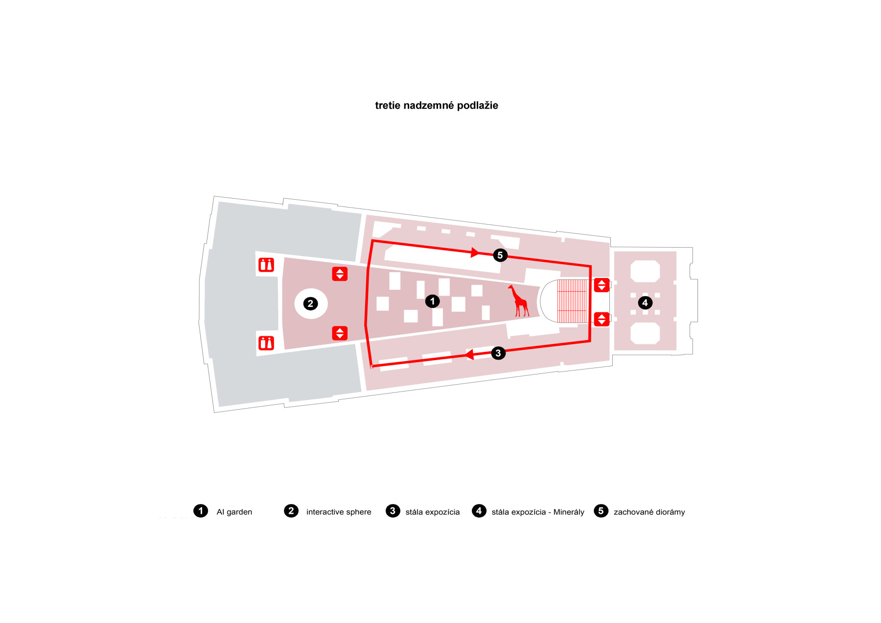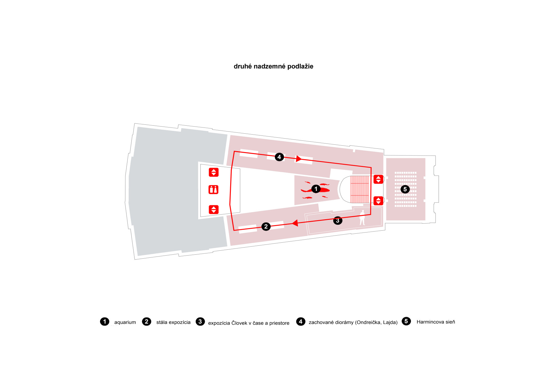 Výstavný okruh: Priestory na 2. NP až 4. NP sú zokruhované cez existujúci balkón a