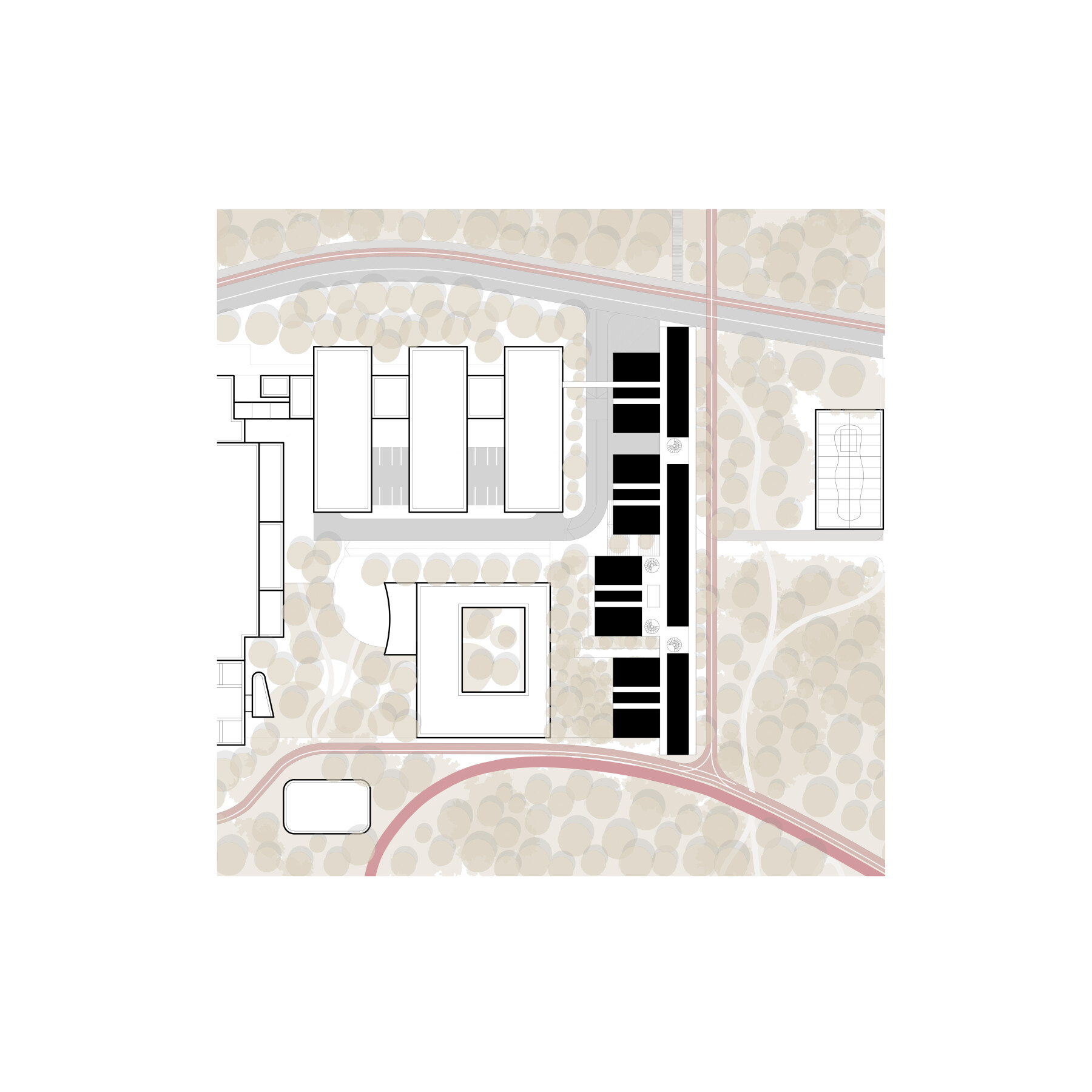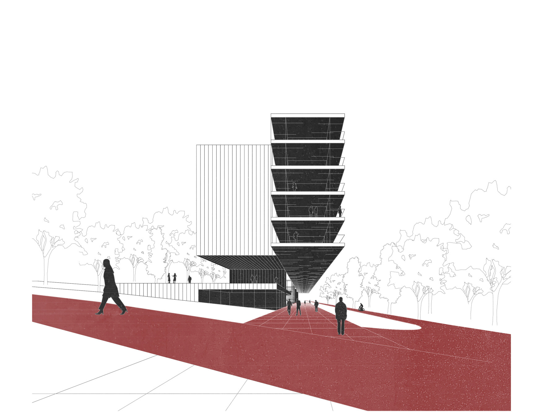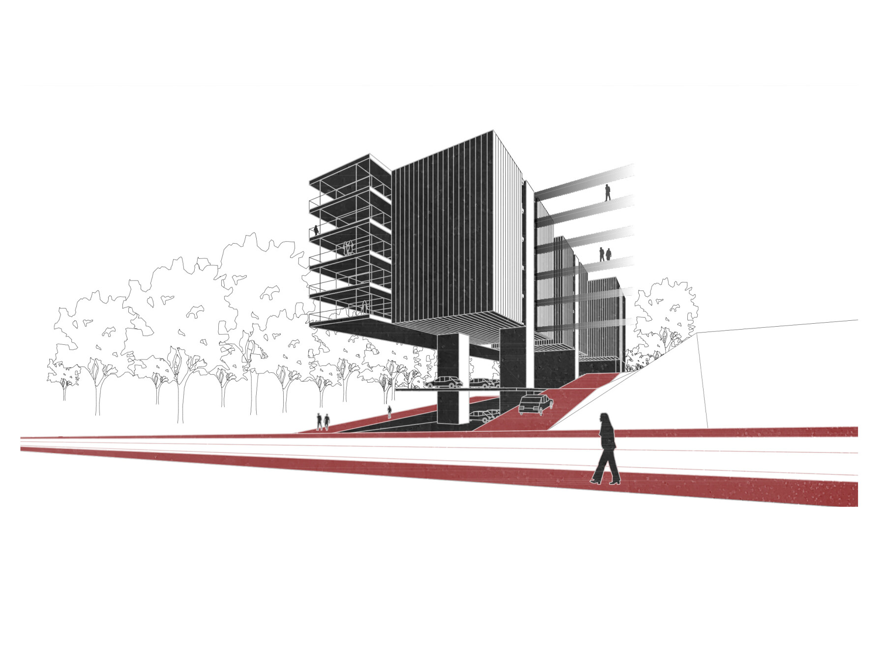 Prízemie je voľné, nevytvára vizuálnu bariéru, naopak spája priestor parku PCEM/ Helix a vnútroblokový areál pobytovým schodiskom. Vznášajúci sa objem vytvára krytú paralelu - líniový verejný priestor, orientovaný do parku. Objem objektu odpovedá funkcii; funkcia kancelárií, denných