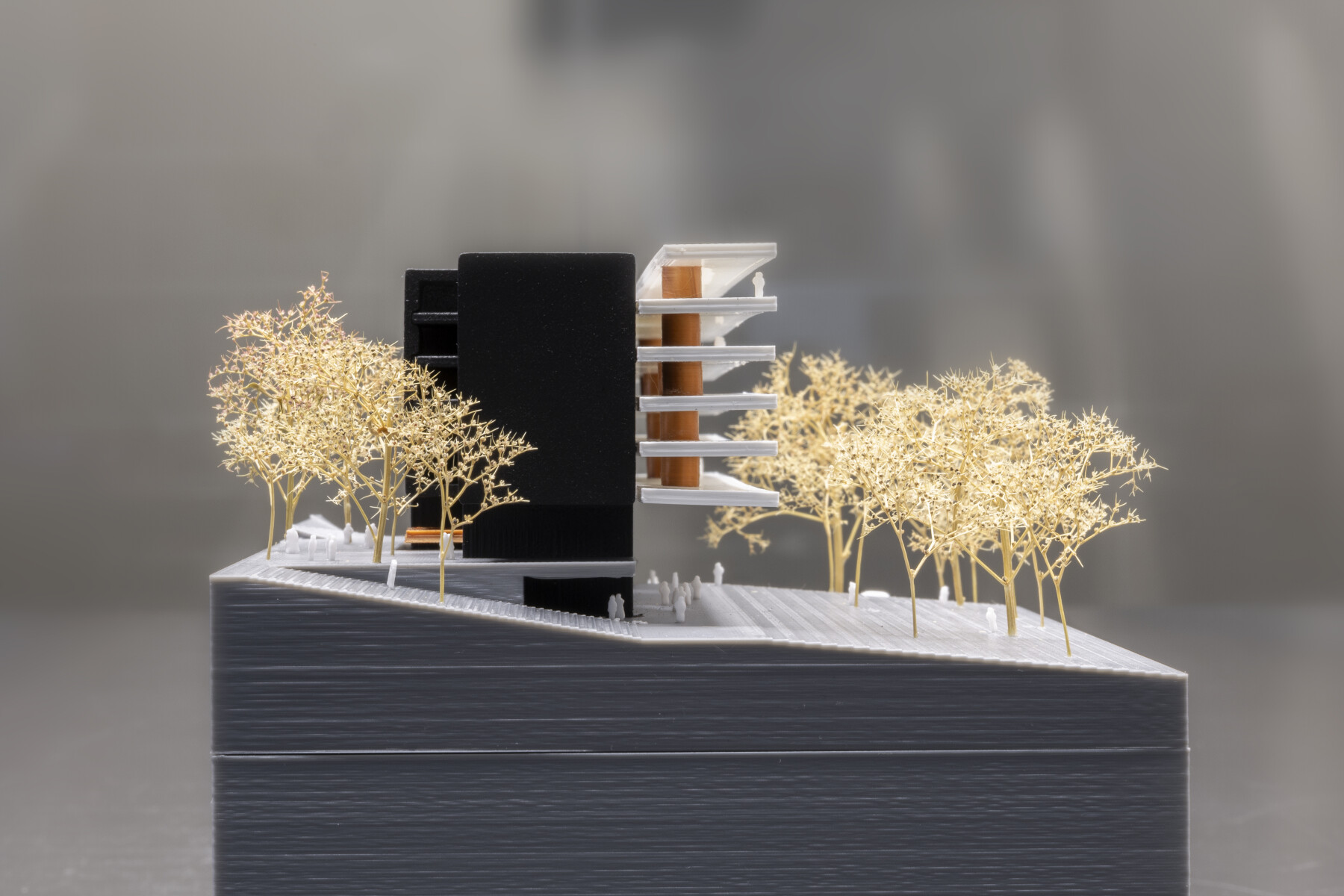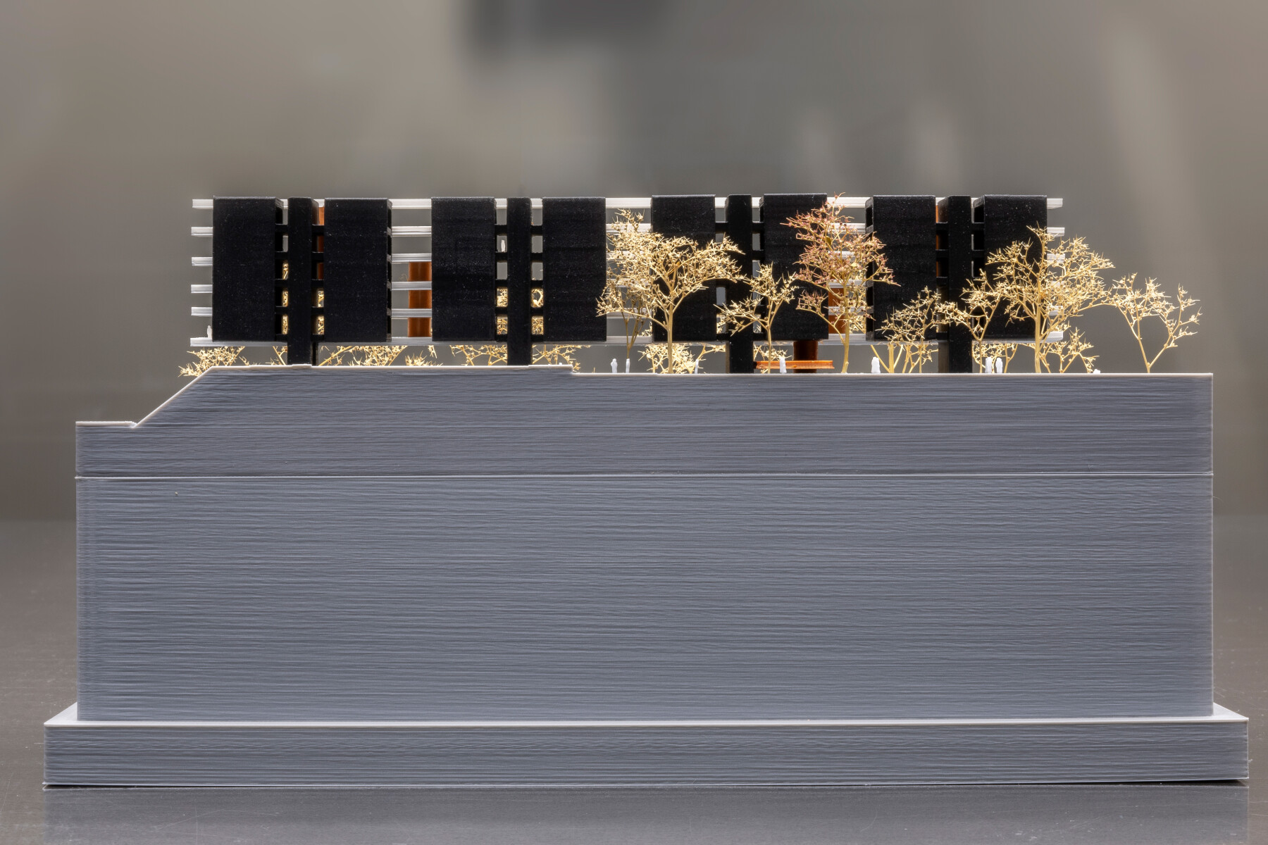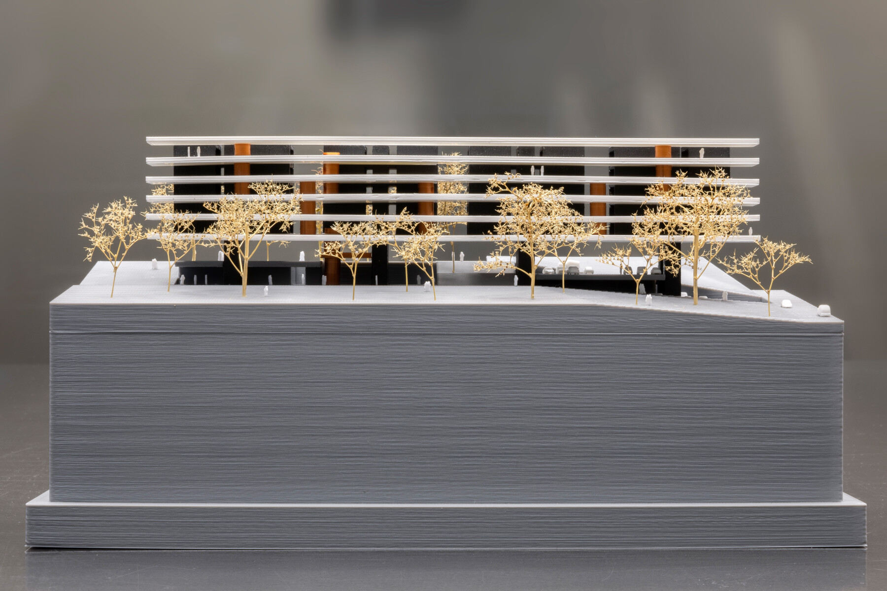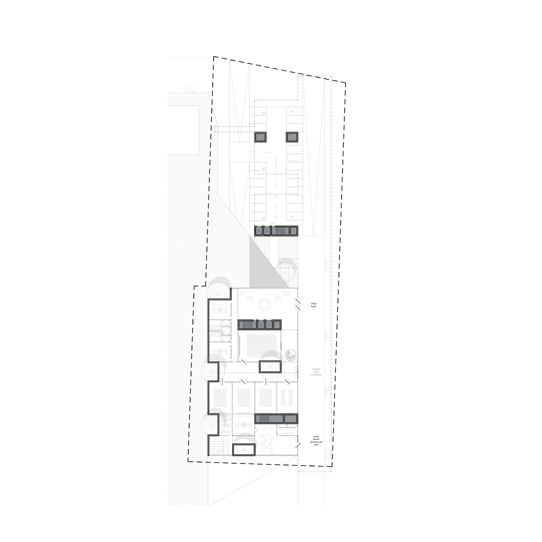 Prízemie je voľné, nevytvára vizuálnu bariéru, naopak spája priestor parku PCEM/ Helix a vnútroblokový areál pobytovým schodiskom. Vznášajúci sa objem vytvára krytú paralelu - líniový verejný priestor, orientovaný do parku. Objem objektu odpovedá funkcii; funkcia kancelárií, denných